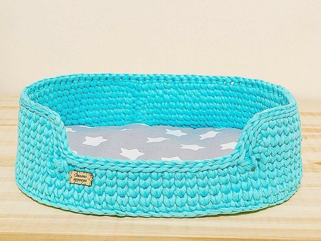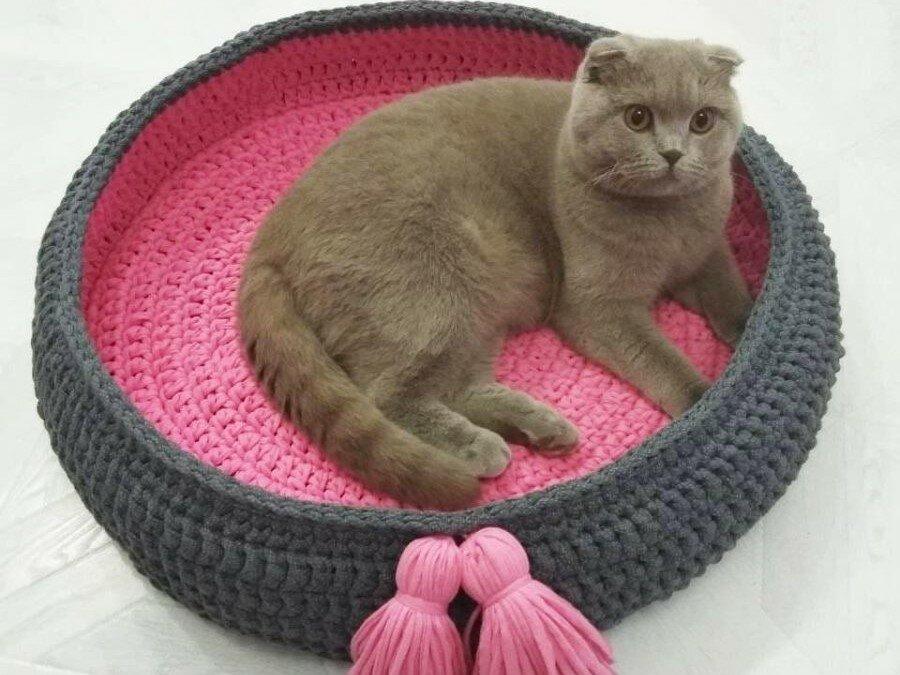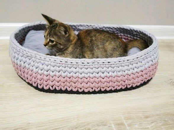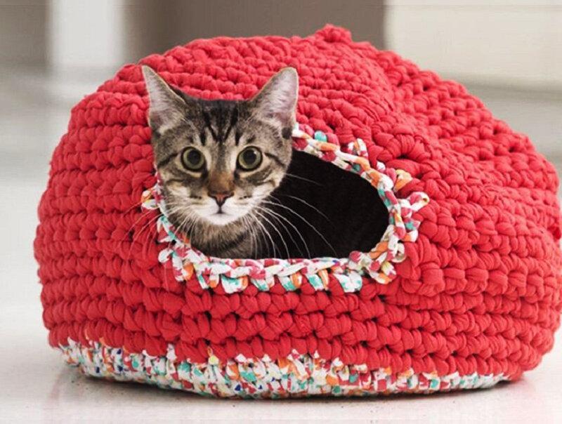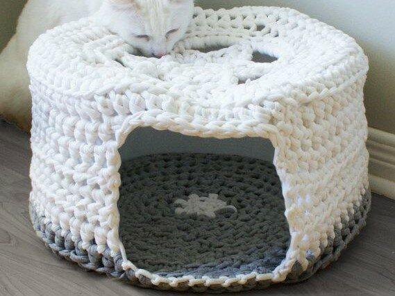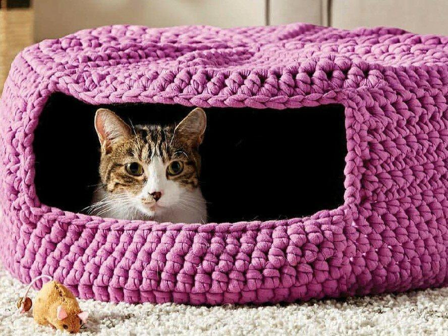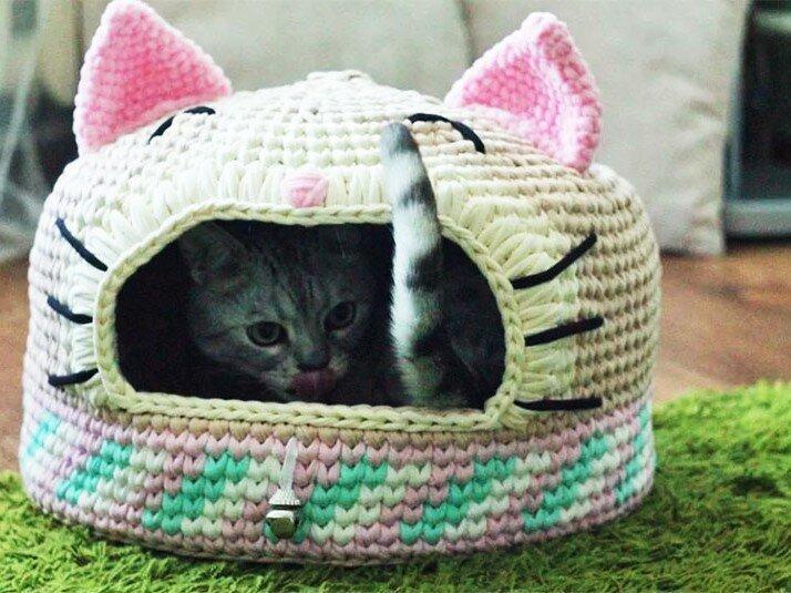 Лежаки вяжутся также, как корзины, только по диаметру вашего кота. А домики могут быть разными. Можно начать с корзинки, довязать до нужной высоты и начать сокращать петли. Не забудьте оставить отверстие-дверь для котика.