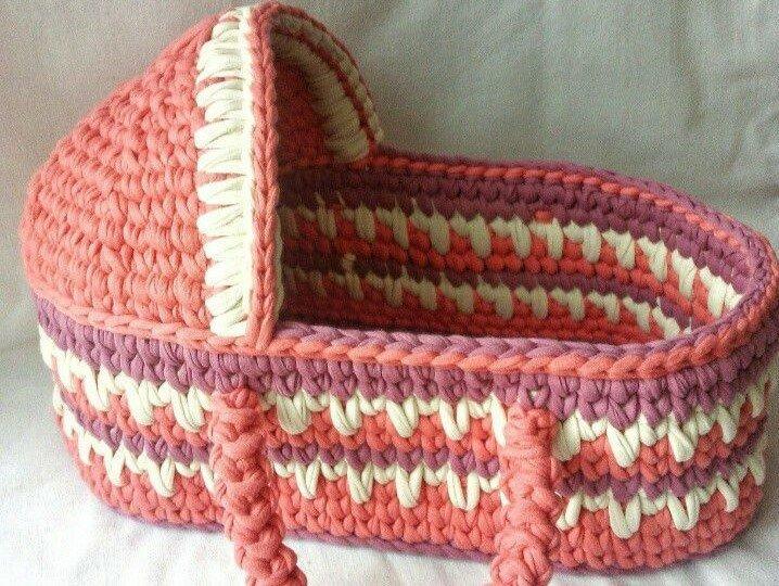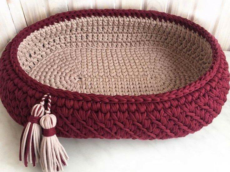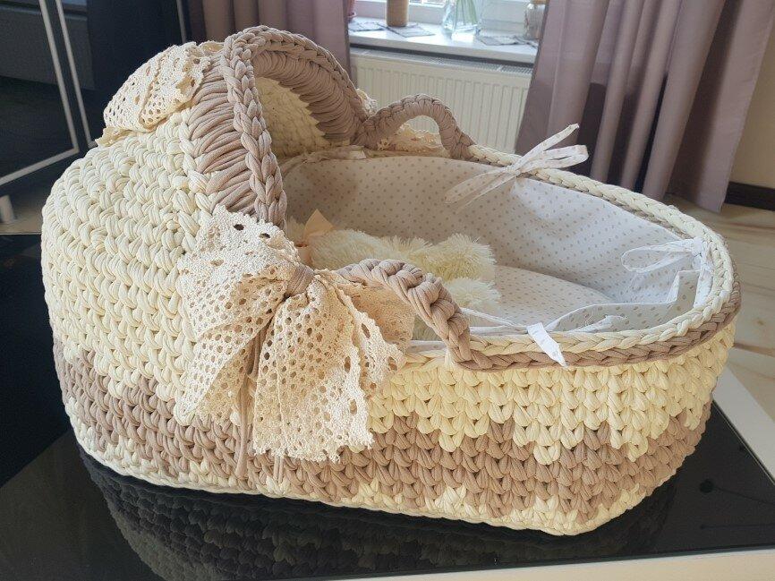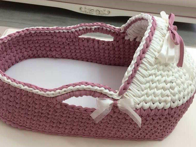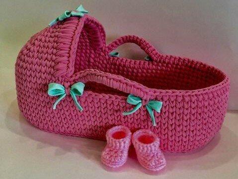 Потрясающие корзинки-люльки для малышей можно связать из трикотажной пряжи. Наверное, они не очень практичны, потому что с младенцем, обычно, перемещаются в коляске или автолюльке. Да и по времени использования их хватит ненадолго.
