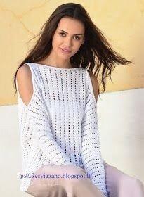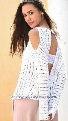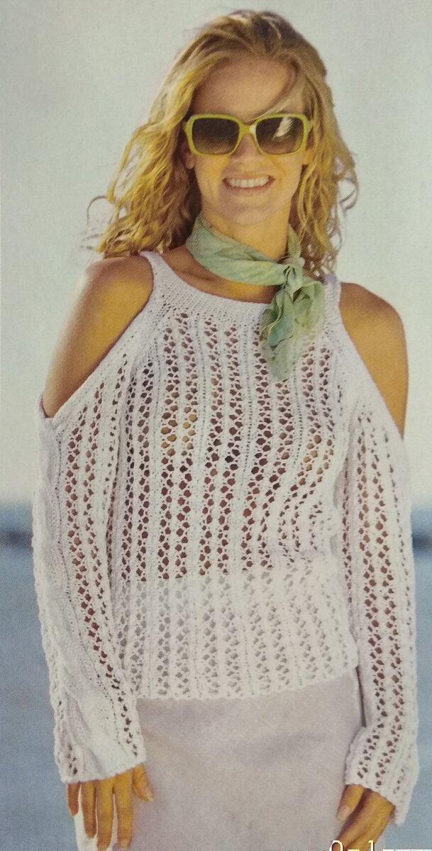 - Сексуальный ажурный пуловер из белоснежной пряжи с открытыми плечами придется, как нельзя, кстати в жаркие летние дни