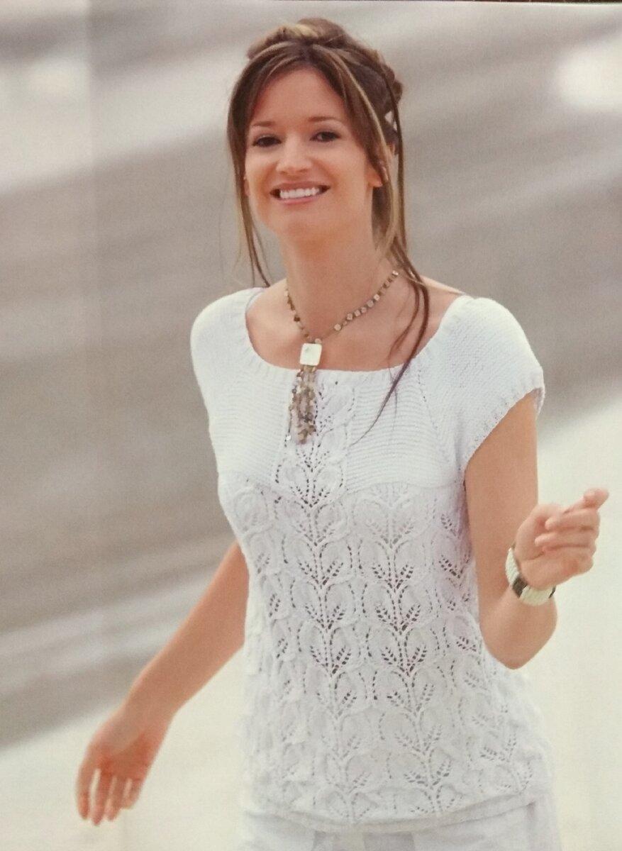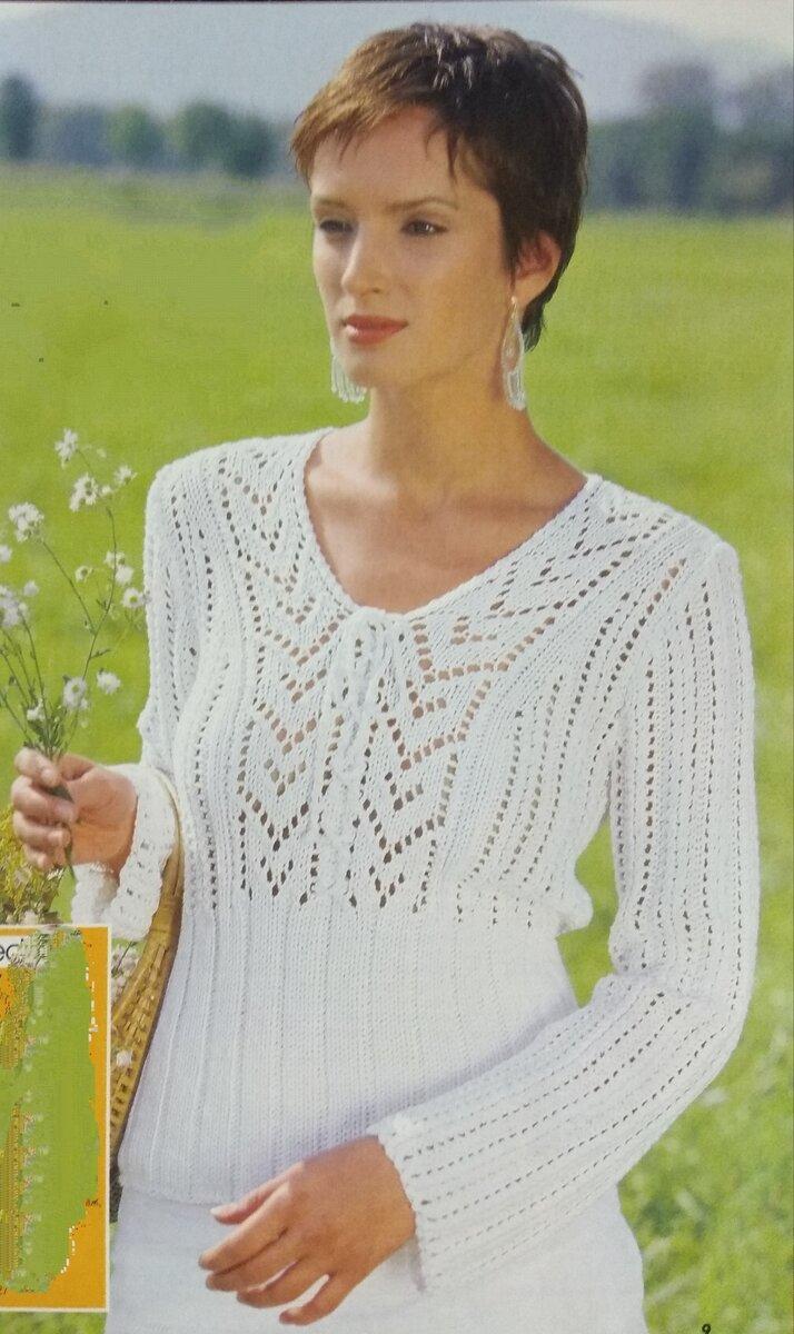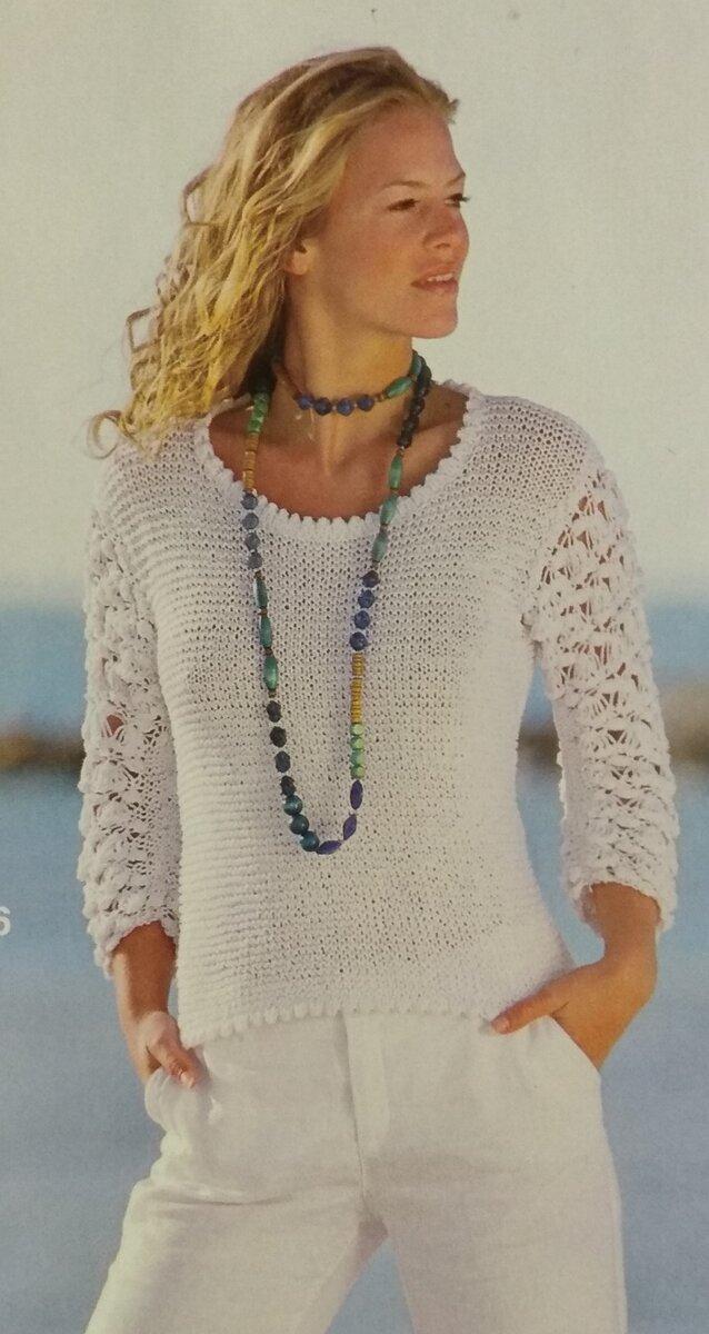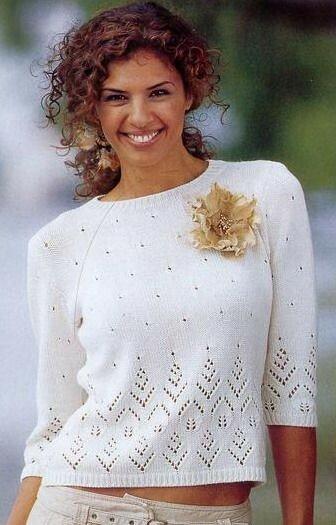 - Облегающий белый пуловер связан просто лицевой гладью, но рукава выполнены ажурным узором, который потребует внимания