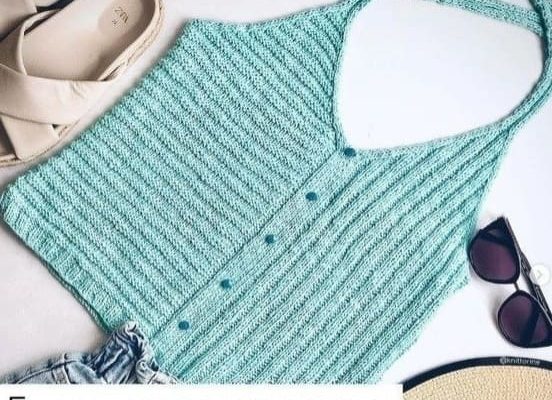 Женский топ с открытой спиной, связанный спицами, представляет собой интересную модную модель, которая выглядит стильно и современно. Особенностью этой модели является необычная вязка на правой и левой полочках.