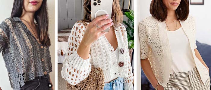 Особое внимание стоит уделить изящному кардигану на пуговицах, который украшен сетчатым узором на спине и плечах. Такое изделие не только подчёркивает женственность, но и идеально подходит для тёплых летних дней, обеспечивая комфорт и стиль одновременно.